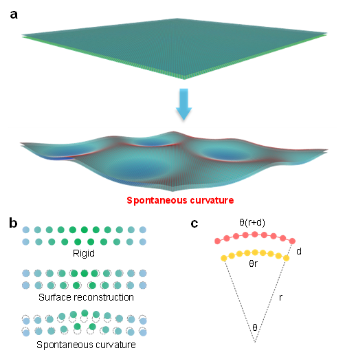 Based on deep-learning-assisted large-scale molecular dynamics simulations, we unveiled “spontaneous curvature” in two-dimensional heterostructures, driven by the competition between stacking energy and deformation energy. This phenomenon demonstrates robustness in the presence of both thermal fluctuations and interlayer lattice orientation mismatch.